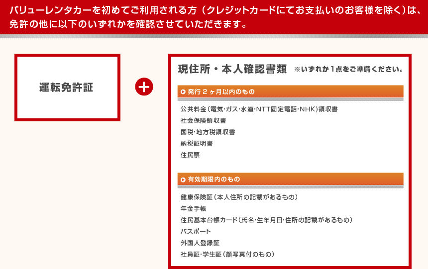 ※クレジットカードご利用のお客様及び、2回目以降ご利用で、 会員カードをご提示いただける場合は上記の書類は不要となります。